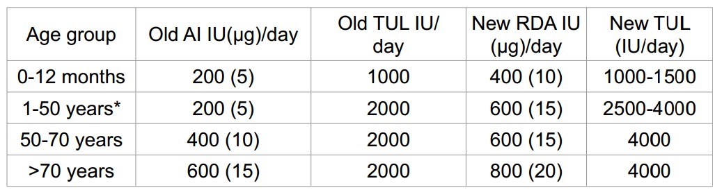 *Includes pregnant and lactating women; AI: Adequate Intakes; IU: International Units; RDA: Recommended Dietary Allowances; TUL: Tolerable Upper Levels.