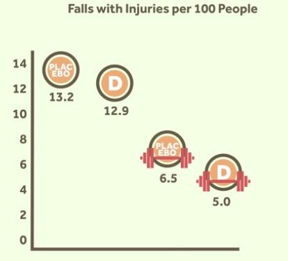 Results Intent-to-treat analyses showed that neither vitamin D nor exercise reduced falls. Fall rates per 100 person-years were 118.2, 132.1, 120.7, and 113.1 in the placebo without exercise, vitamin D without exercise, placebo and exercise, and vitamin D and exercise study groups, respectively; however, injurious fall rates were 13.2, 12.9, 6.5, and 5.0, respectively. Hazard ratios for injured fallers were significantly lower among exercisers with vitamin D (0.38; 95% CI, 0.17-0.83) and without vitamin D (0.47; 95% CI, 0.23-0.99). Vitamin D maintained femoral neck bone mineral density and increased tibial trabecular density slightly. However, only exercise improved muscle strength and balance. Vitamin D did not enhance exercise effects on physical functioning.