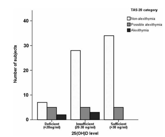 Objective: Vitamin D plays an important role in brain development and functioning. Low levels of vitamin D have been described in several psychiatric and neurologic conditions including autism spectrum disorder. Alexithymia that shows high comorbidity with autism is also present in the general population as well as hypovitaminosis D.Methods: Here we assessed the relation between alexithymia as measured by the Toronto Alexithymia Scale-20 and vitamin D level in healthy young adults.