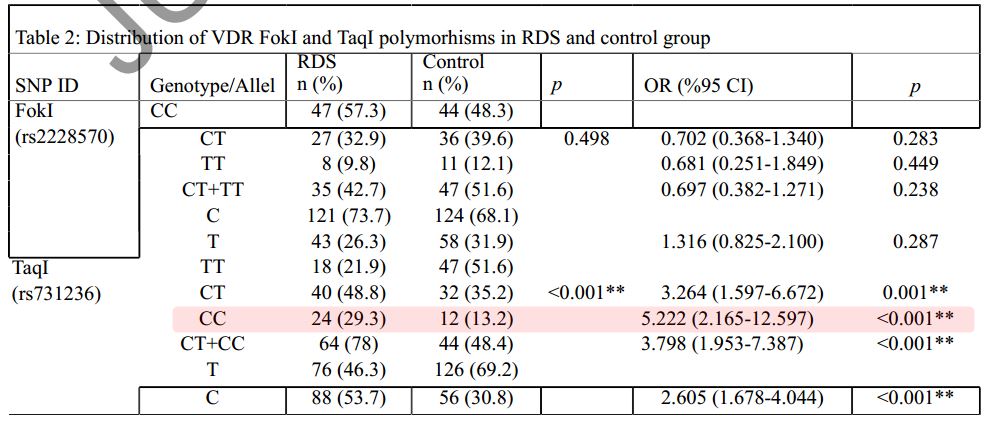 Association of vitamin D receptor gene FokI and TaqI polymorphisms and risk of RDS.