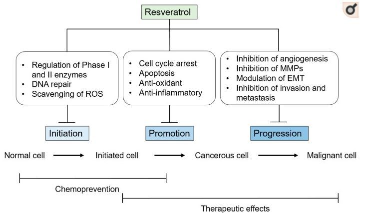 Resveratrol is a pleiotropic phytochemical belonging to the stilbene family. Though it is only significantly present in grape products, a huge amount of preclinical studies investigated its anticancer properties in a plethora of cellular and animal models. Molecular mechanisms of resveratrol involved signaling pathways related to extracellular growth factors and receptor tyrosine kinases; formation of multiprotein complexes and cell metabolism; cell proliferation and genome instability; cytoplasmic tyrosine kinase signaling (cytokine, integrin, and developmental pathways); signal transduction by the transforming growth factor-β super-family; apoptosis and inflammation; and immune surveillance and hormone signaling. Resveratrol also showed a promising role to counteract multidrug resistance: in adjuvant therapy, associated with 5-fluoruracyl and cisplatin, resveratrol had additive and/or synergistic effects increasing the chemosensitization of cancer cells. Resveratrol, by acting on diverse mechanisms simultaneously, has been emphasized as a promising, multi-target, anticancer agent, relevant in both cancer prevention and treatment.