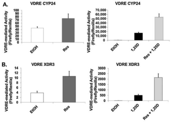 The 1,25-dihydroxyvitamin D3 (1,25D) hormone is derived from vitamin D generated in skin or obtained from the diet, and binds to and activates the vitamin D receptor (VDR) in target tissues including kidney, colon/small intestine, and bone/muscle. We tested resveratrol for its ability to modulate VDR signaling, using vitamin D responsive element (VDRE) and mammalian 2-hybrid (M2H) transcriptional system technology. Via VDRE-based assays in kidney, colon and myoblast cells, VDR-mediated transcription was activated by resveratrol, and a cooperative effect on transactivation was observed with resveratrol plus 1,25D. The M2H assay revealed a modest, resveratrol-induced dimerization of VDR with its retinoid X receptor (RXR) heteropartner. Cells treated with both resveratrol and 1,25D displayed synergistic stimulation of VDR-RXR heterodimerization, while resveratrol antagonized rexinoid-mediated RXR-RXR homodimerization. Increased transactivation in response to resveratrol was also observed with a subset of other nuclear receptors and their respective cognate responsive elements. Evaluation of wild-type versus a ligand-binding domain mutant VDR revealed that hormone-responsiveness to 1,25D was severely depressed, while the response to resveratrol was only moderately attenuated. Moreover, radiolabeled 1,25D-displacement assays demonstrated an increase in VDR-bound 1,25D in the presence of resveratrol. Thus, resveratrol may affect VDR and other nuclear receptors indirectly, likely via the ability of resveratrol to: (1) potentiate 1,25D binding to VDR; (2) activate RXR; and/or (3) stimulate SIRT1, an enzyme known to deacetylate nuclear receptors. The results of this study elucidate a possible pathway for crosstalk between two nutritionally derived lipids, vitamin D and resveratrol, both of which converge on VDR signaling.