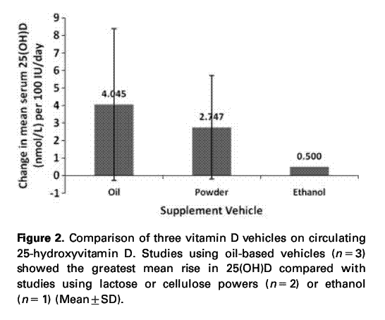 Vitamin D insufficiency is a common medical condition. Vitamin supplements can be ingested to improve vitamin D status. It is not known if the vehicle substance that is combined with the vitamin D tablet influences the bioavailability of vitamin D. The purpose of this review is to examine the impact of different vehicles on vitamin D bioavailability. A comprehensive literature search identified studies that directly compared the absorption of vitamin D from two or more vehicles. The change in mean serum 25(OH)D per average daily dose of vitamin D supplemented was calculated and compared among the studies. We identified four clinical studies that compared two different vehicles of vitamin D. Vitamin D in an oil vehicle produced a greater 25(OH)D response than vitamin D in a powder or an ethanol vehicle in healthy subjects. There are limited studies that have compared the influence of the vehicle substance on vitamin D bioavailability. Future studies should examine bioavailability among different vehicle substances such as oil, lactose powder, and ethanol and examine if there are any differences in bioavailability among different patient populations including those with fat malabsorption.