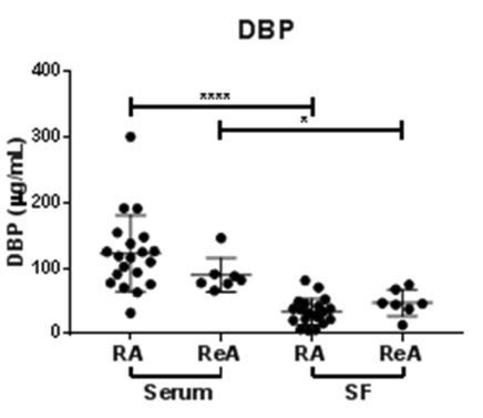 Concentrations of DBP were significantly lower in RA SF (median 33 pg/ml, 95% confidence limits 24.37-43.19) and ReA SF (median 35.82, 95% confidence limits 19.25-77.98) relative paired serum for RA (median 117 pg/ml, 95% confidence limits 95.38-149.8, p < 0.001) and ReA (median 85.66, 95% confidence limits 68.48-103.1, p = 0.0156) patients (Fig. 4). Albumin concentrations were also significantly lower in RA SF (median 1.423 g/dL, 95% confidence limits 1.398-1.712) vs paired serum (median 2.22 g/dL, 95% confidence limits 2.054-2.602, p = 0.0005).