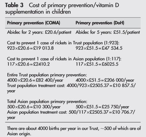 RESULTS: Fourteen patients were identified, of whom 86% presented in the last 5 years and 93% were of Asian origin. The incidence of vitamin D deficiency for our population is 1 in 923 children overall and 1 in 117 in children of Asian origin. The average cost of treatment for each such child is pound 2500, while the theoretical cost of prevention of vitamin D deficiency in the Asian population through primary prevention according to COMA guidance is pound2400 per case.