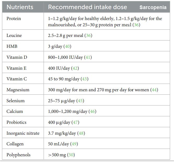 Sarcopenia is a syndrome characterized by a decline in muscular mass, strength, and function with advancing age. The risk of falls, fragility, hospitalization, and death is considerably increased in the senior population due to sarcopenia. Although there is no conclusive evidence for drug treatment, resistance training has been unanimously recognized as a first-line treatment for managing sarcopenia, and numerous studies have also pointed to the combination of nutritional supplementation and resistance training as a more effective intervention to improve quality of life for people with sarcopenia. People with both malnutrition and sarcopenia have a higher mortality rate, so identifying people at risk of malnutrition and intervening early is extremely important to avoid sarcopenia and its associated problems. This article provides important information for dietary interventions in sarcopenia by summarizing the discoveries and developments of nutritional supplements such as- protein,