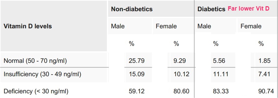 There was a high incidence of vitamin D deficiency among KFU Health Center patients. The vitamin D level was inversely proportional to the level of fasting glucose and HbA1c. There is an evident role of vitamin D deficiency on glucose tolerance in diabetic patients.Saudi study defines normal Vitamin D level to be 50 to 70 ng (diabetes, etc.) - June 2020Printer Friendly Follow this page for updates13401 visitors, last modified 30 May, 2021, This page is in the following categories (# of items in each category)Attached files