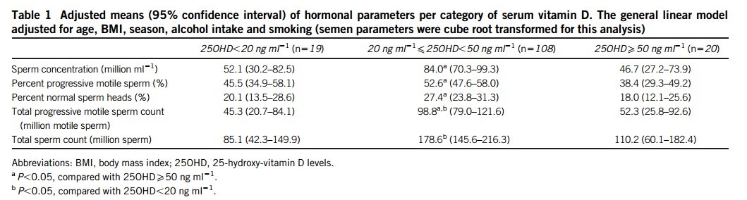 Sperm concentration, sperm progressive motility, sperm morphology, and total progressively motile sperm count were lower in men with '25OHD?50 ng ml(-1)' when compared to men with '20 ng ml(-1)?25OHD<50 ng ml(-1)'.