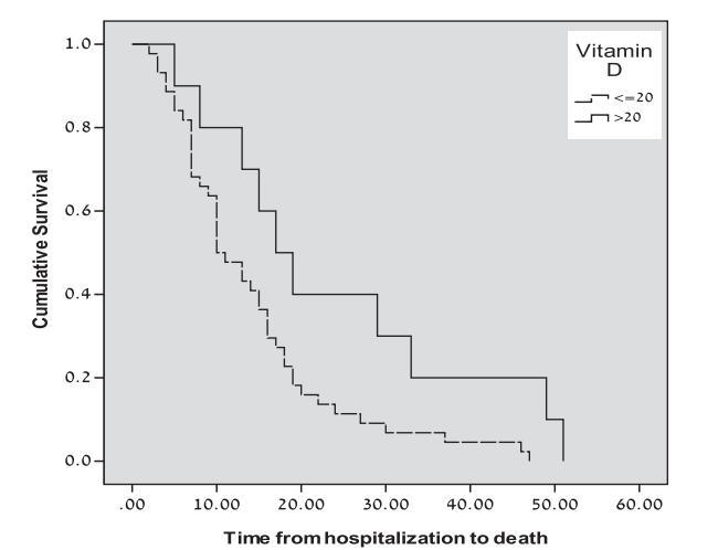Between December 2008 and June 2009, 130 patients were enrolled. Average vitamin D concentration was 14.04?±?6.9?ng/ml; 107 patients were vitamin D deficient (<?20?ng/ml). Total mortality rate after 60 days was 44.3%. Vitamin D levels were correlated with white blood cell (WBC) count, but with no other measured variable. Among the deceased patients, survival curves indicated that survival of patients with vitamin D deficiency was significantly shorter than those whose vitamin D concentration was >20?ng/ml (P?<?0.05); the average survival time was 15.3?±?12.4 days for vitamin D deficient patients compared with 24.2?±?16.5 days among those with normal vitamin D levels.
