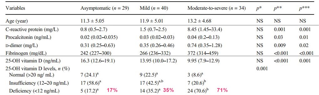 Conclusion: This study revealed an association between vitamin D deficiency and clinical severity, in addition to inflammation markers in pediatric COVID-19 cases. Prophylactic vitamin D supplementation may be considered, especially in the adolescent age group.