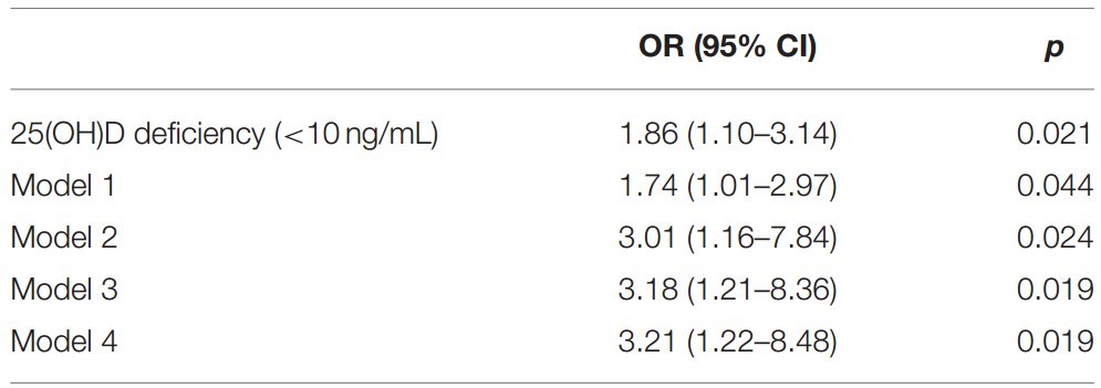• Model 2 included variables in model 1 plus NIHSS and NIHSS*25-hydroxyvitamin D deficiency interaction term.
