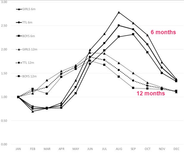This outcome applied to the ASQ-3 score itself and to the adjusted Relative Risk (aRR), with the highest aRRs (relative to January-born) among August-born (aRR 2.51; 95%CI 2.27-2.78 at 6 months), and June-born (aRR 1.84; 95%CI 1.63-2.09 at 12 months). Boys had better scores than girls both at 6 and 12 months of age. We speculate that seasonal factors-such as maternal vitamin D deficiency and influenza infection-affecting the fetus in early pregnancy might account for the findings.Summer births associated with 2X slower gross motor development at 6 months – May 2021Printer Friendly Follow this page for updates4579 visitors, last modified 21 May, 2021, This page is in the following categories (# of items in each category)