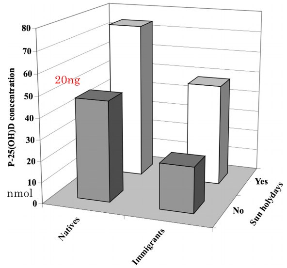 Plasma concentration of 25-OH-vitamin D below 25 nmol/L was found in 61% (19/31) of immigrant and 7% (2/30) of native women. Multivariate analysis showed that reported sun holiday of one week during the last year at latitude below 40°N with the purpose of sun-bathing and native origin, were significantly, independently and positively associated with 25-OH-vitamin D concentrations in plasma with the strongest association for sun holiday during the past year.
