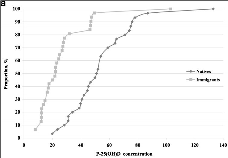 Results: Plasma concentration of 25-OH-vitamin D below 25 nmol/L was found in 61% (19/31) of immigrant and 7% (2/30) of native women. Multivariate analysis showed that reported sun holiday of one week during the last year at latitude below 40°N with the purpose of sunbathing, BMI and native origin, were significantly, independently and positively associated with 25-OH-vitamin D concentrations in plasma with the strongest association for sun holiday during the past year.