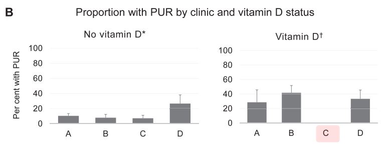 Only 11/53 (21%) of patients at clinic C were prescribed vitamin D, and none had an observed PUR (Figure B )"
