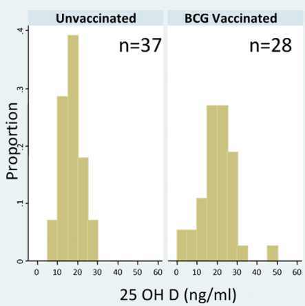 Conclusions: Vitamin D may play an immuno-regulatory role following BCG vaccination. The increased vitamin D concentrations in BCG vaccinated infants could have important implications: vitamin D may play a role in immunity induced by BCG vaccination and may contribute to non-specific effects observed following BCG vaccination.
