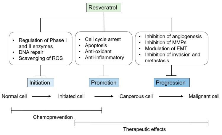 Using a variety of in vivo and in vitro models, it has been proven that resveratrol is capable of attenuating the various stages of carcinogenesis, some of which are briefly described in Figure 2. A vast body of experimental in vivo and in vitro studies and a few clinical trials has presented evidence of resveratrol's great potential as an anti-cancer agent, both for the prevention and therapy of a large range of cancers.