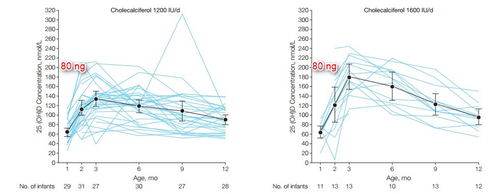 - Summary: 1600 IU vitamin D daily ==> 98% of infants > 30 ng