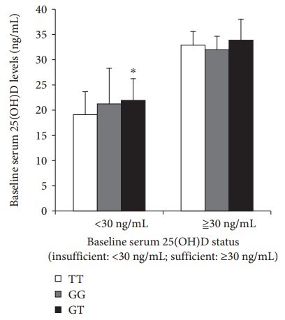 At baseline, the average serum 25(OH)D level was 22.71 ± 6.87 ng/mL, and 17.9% of patients had a ≥30 ng/mL level. During supplementation, the level of 25(OH)D increased significantly at each time point, and the average 25(OH)D level increased to 30.61 ± 5.04 ng/mL; however, there were 44.6% of patients whose serum 25(OH)D levels were still below 30 ng/mL. In the patients with CYP27B1 (rs10877012) G/T genotype, 71.79% achieved sufficient level of 25(OH)D, which was significantly higher than the other two genotypes (P < 0.05). Compared with those with T/T genotype, the RR of the patients with rs10877012 for <30 ng/mL level was 0.544 (95% CI: 0.291-0.917), and the RR after adjusting age and outdoor activity was 0.560 (95% CI: 0.292-0.970).CONCLUSION: