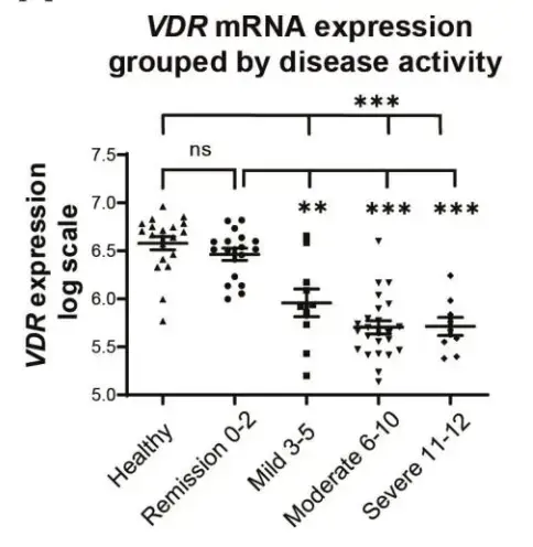 Note: VDR is a log scale. log of 5.6 is 1/10 of log of 6.6Background and aims: Epidemiological studies have shown that subnormal levels of vitamin D (25(OH)D) are associated with a more aggravated clinical course of ulcerative colitis (UC). Despite an increased focus on the therapeutic importance of vitamin D and vitamin D receptor (VDR) signaling, the mechanisms underlying the effects of the vitamin D-VDR axis on UC remain elusive. Therefore, we aimed to investigate whether exposure to active vitamin D (1,25(OH)2D3)/VDR signaling in human organoids could influence the maintenance of the colonic epithelium.