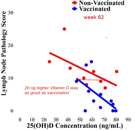 All animals were infected with 7,600 cfu of M. bovis 52 wk postvaccination, and lung and lymph node tissues were assessed for pathology following euthanasia after wk 65. Blood samples were taken throughout wk 0 to 65. Serum 25-hydroxyvitamin D [25(OH)D] concentrations were measured using a commercial ELISA. A mixed-effects linear regression model revealed significantly higher 25(OH)D concentrations in the vaccinates postinfection (wk 65) compared with the nonvaccinates. Linear regression analysis between 25(OH)D concentration and the level of M. bovis-driven pathology revealed a negative linear relationship (i.e., higher concentrations were associated with lower pathology scores) irrespective of vaccination status. No correlation was detected between IFN-γ cytokine production and vitD concentration.