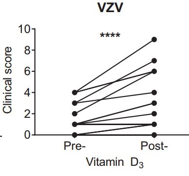 Vitamin D insufficient older adults (n = 18) were administered 6400IU of vitamin D3/day orally for 14 weeks. Antigen-specific immunity to VZV was assessed by clinical score assessment of the injection site and transcriptional analysis of skin biopsies collected from challenged injection sites pre- and post-vitamin D3 replacement.