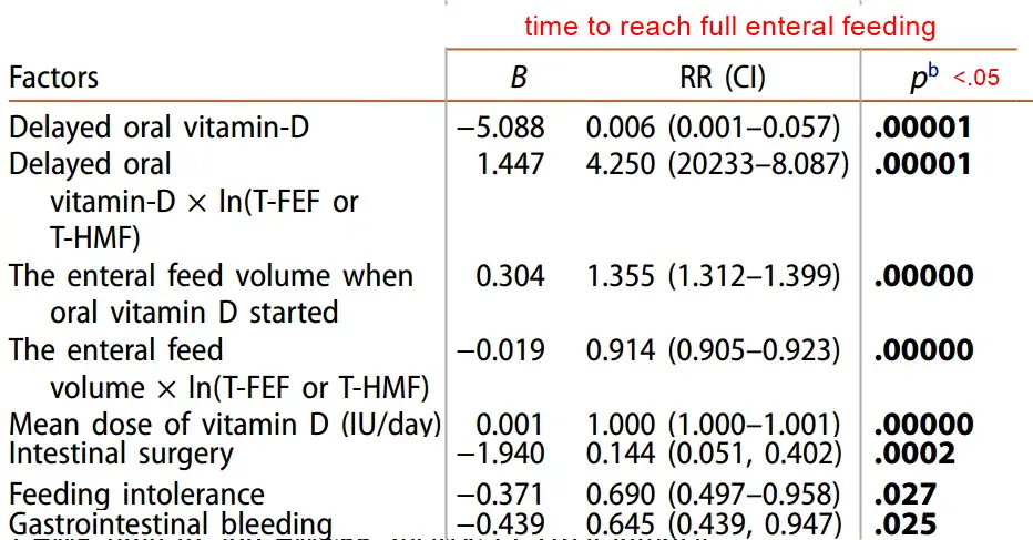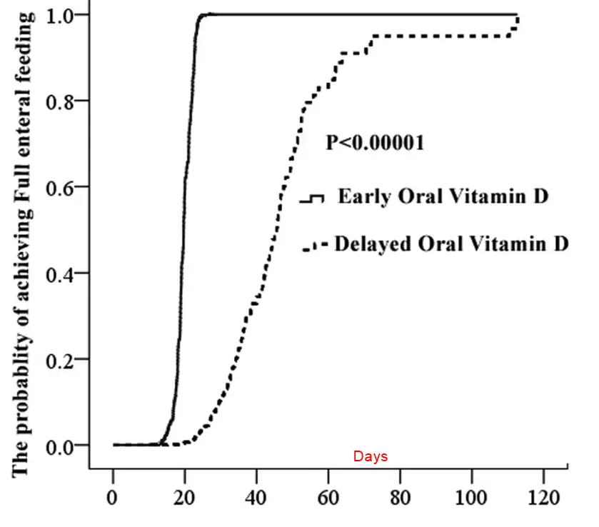Results: Multivariate Cox regression for the time to reach full enteral feeding (T-FEF) and time to add human milk fortifier (T-HMF) were analyzed respectively. Delayed oral vitamin D supplementation (after postnatal day 13) was independently and negatively associated with the cumulative probability of achieving FEF (B - 5.088, RR 0.006 (0.001-0.057), p < .00001). Delayed oral vitamin D supplementation was independently and negatively associated with the cumulative probability of adding human milk fortifier (HMF) (B - 3.115, RR 0.044 (0.006-0.334), p = .002). The hazard effect of the delayed supplementation diminished over time, with the RR = EXP(-5.088 + 1.447 × Ln(T-FEF)) or RR = EXP(-3.115 + 0.729 × Ln(T-HMF)), respectively.