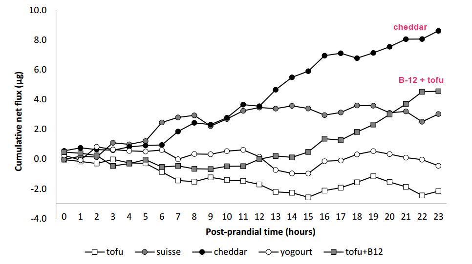 The present study compares the bioavailability of vitamin B12 (B12) of dairy products or synthetic B12, using the pig as an experimental model for humans. Eleven pigs were used in a cross-over design to assess the net portal drained viscera (PDV) flux of blood plasma B12 after ingestion of tofu (TF; devoid of B12), Swiss cheese (SC), Cheddar cheese (CC), yogurt (YG), and synthetic B12 (TB12; TF supplemented with cyanocobalamin), providing a total of 25 µg of B12 each. PDV blood plasma flow for SC and CC were higher than for TF and TB12 (p ≤ 0.04) whereas YG was higher than TF (p = 0.05). Porto-arterial difference of blood plasma B12 concentrations were higher for CC and TB12 than for TF and YG (p ≤ 0.04) but not different from SC (p ≥ 0.15). Net PDV flux of B12 was only different from zero for CC. However, the net PDV flux of B12 for CC was not different from SC or TB12. Cumulative net PDV flux of B12 for SC, TB12, and CC were 2.9, 4.4, and 8.3 µg 23 h post-meal, corresponding to a bioavailability of 11.6%, 17.5%, and 33.0%, respectively.