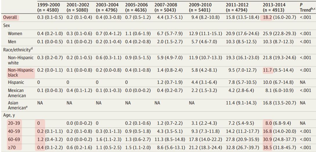 Repeat cross-sectional data from the nationally representative National Health and Nutrition Examination Survey (NHANES) were used. NHANES, which includes survey and examination components, samples noninstitutionalized US residents through a complex, stratified, multistage probability sampling design with certain populations overrepresented (overall response, 74%).3 Informed consent was obtained from participants of the NHANES study. This analysis was based on anonymized data freely available to the public and, therefore, was exempt from ethics review.