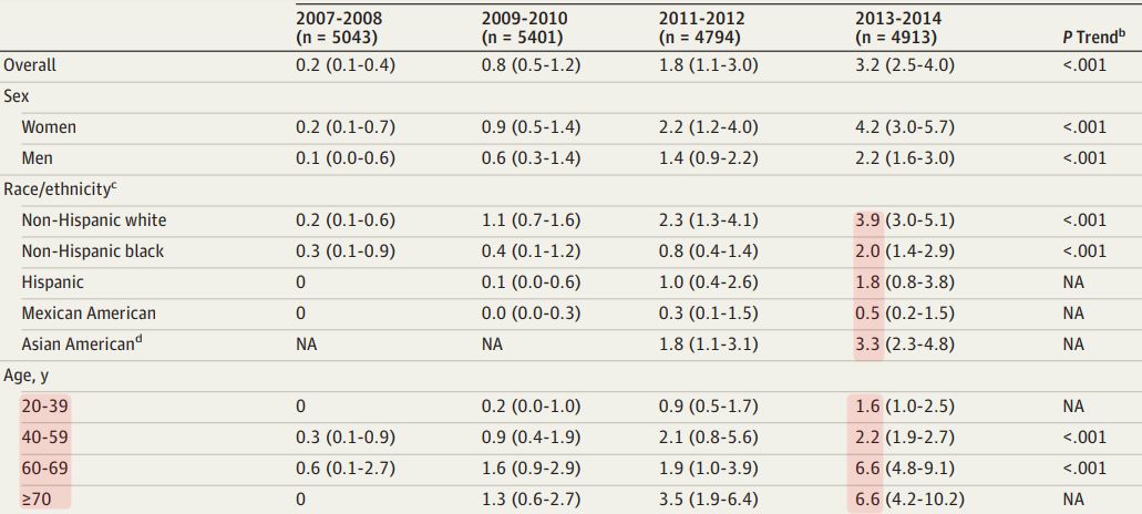 In 2013-2014, prevalence of daily supplemental intake of 4000 IU or more was 3.2% (95% CI, 2.5%-4.0%) (Table 2). Prior to 2005-2006, prevalence of daily intake of 4000 IU or more was less than 0.1% (P for trend from 2007-2014: <.001).