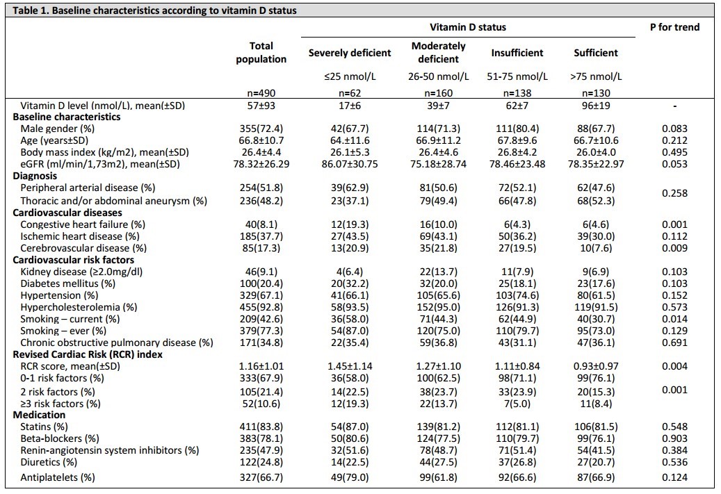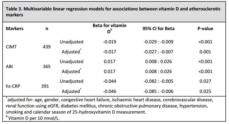 Adjusting for clinical cardiovascular risk factors, multivariable regression analyses showed that low vitamin D status was associated with