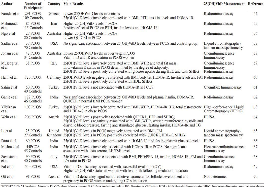 In contrast with the aforementioned findings, one study failed to confirm any difference in 25(OH)VitD levels between PCOS patients (n=37) and the control (n=70) group. However, the investigated population were adolescent females and only 13% of them were vitamin D sufficient (>30 ng/ml), which could have biased the results.57