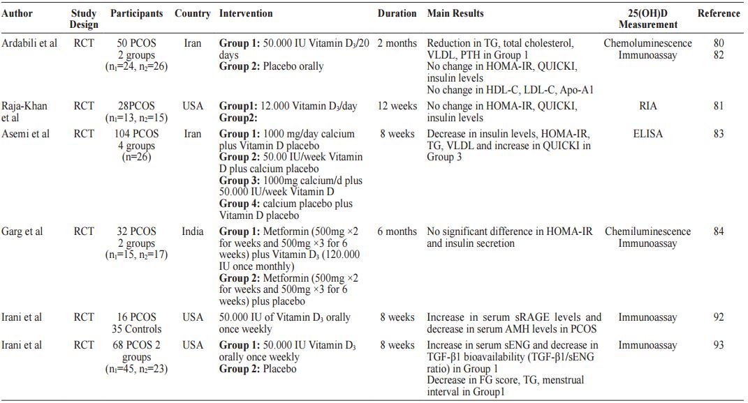 The association between vitamin D and endometriosis is based on the following findings: 1) the human endometrium expresses VDR and la-hydroxylase, thus it could be a possible site of extrarenal synthesis and action of vitamin D;98 2) vitamin D has immunomodulatory effects; macrophages, dendriticTABLE 2. Vitamin D and PCOS – Interventional Studies.