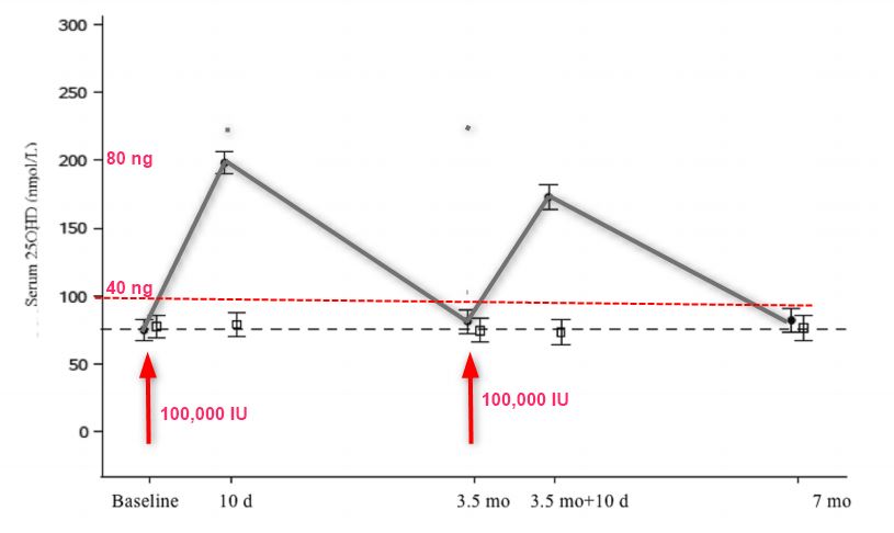 Two oral boluses of 100,000 IU vitamin D3,once in the fall and once in the winter, rapidly, safely, and significantly raises overall serum vitamin D metabolites. However, it is sufficient to maintain 25OHD ≥ 75 nmol/L throughout 7 months in only slightly more than half of participants.