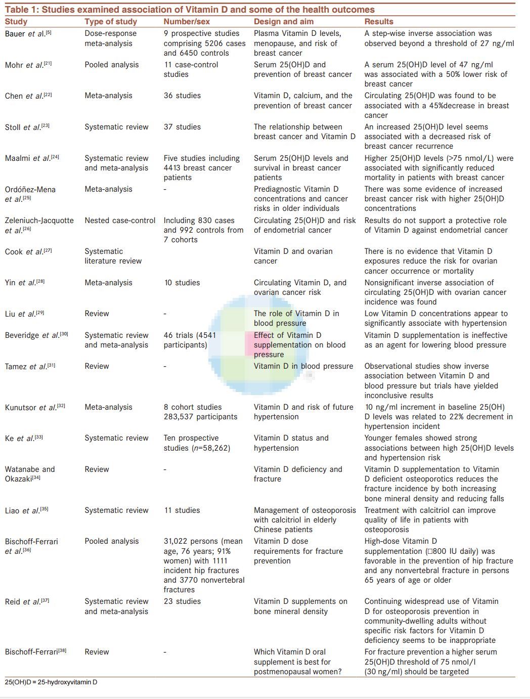 Many studies have represented that Vitamin D supplementation and high 25(OH)D levels can decrease the risk of breast cancer occurrence or mortality. However, there is no strong evidence to support the existence of a relationship between Vitamin D and ovarian or endometrial cancers. Furthermore, the results regarding the effects of Vitamin D on hypertension were inconsistent. Although observational studies have shown an association between Vitamin D and hypertension, there is no evidence regarding effectiveness of Vitamin D in lowering blood pressure in several clinical trials. On the other hand, the findings associating the impact of Vitamin D on osteoporosis were more definitive and most studies have represented that Vitamin D may have beneficial effects on osteoporosis.CONCLUSION: