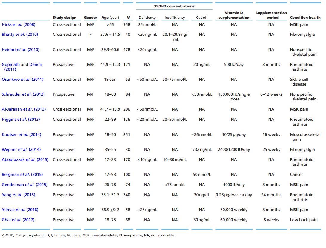 Different anatomical regions may be the targets of musculoskeletal pain such as the lower limbs (legs and knees) and back. This chronic pain condition causes socioeconomic and psychological harms. Moreover, the cause of these disorders is often associated with several factors such as age, gender, diet and psychological status (McBeth & Jones 2007). Researchers have shown that women with 25OHD serum levels <20 ng/mL have a higher chance of developing pain (Table 2) (Hicks et al. 2008, Heidari et al. 2010). Several studies have indicated that vitamin D supplementation (Table 2) is effective in reducing complaints in specific or nonspecific musculoskeletal pain disorders (Schreuder et al. 2012, Gendelman et al. 2015, Yilmaz et al. 2016, Ghai et al. 2017). In a recent meta-analysis (Table 2), Wu and colleagues (Wu et al. 2016) reported, in a subgroup analysis of vitamin D group vs placebo, that vitamin D supplementation for an average time duration of 3 months reduced pain in conditions such as myalgia, arthritis and chronic musculoskeletal pain. This result was observed in hospitalized patients with pain-related medical conditions. Although some studies have shown a negative association between musculoskeletal pain and serum 25OHD, little is known about the mechanisms involved in this relationship (Table 2) (Al-Jarallah et al. 2013, Knutsen et al. 2014).