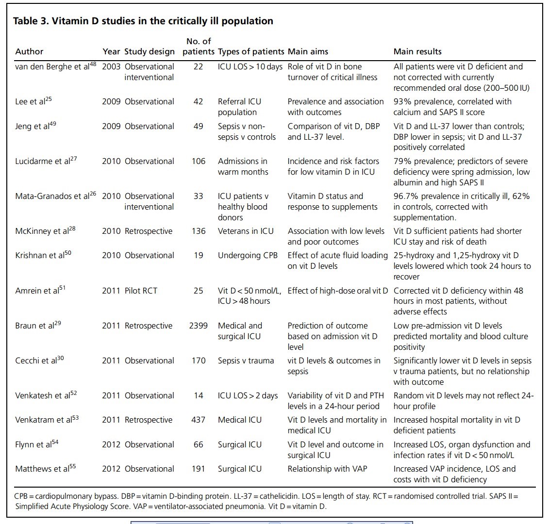 - 3X more likely to die within 3 months of being in ICU for 2 days if less than 20 ng vitamin D – Sept 2013