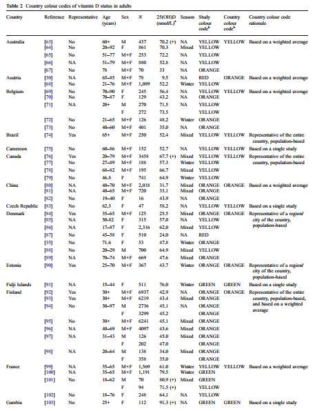 Several limitations are inherent in the way that the published data were presented. For example, 25(OH)D measurements were sometimes made in specific seasons (i.e. winter or summer) and at other times made without reference to season. When the option was available, we used the winter measurement, representing the worst-case scenario, for the map colouration; however, 25(OH)D levels by season, when available, are provided in the table. There was inconsistency across studies in the age groupings such that we were not always able to break out the levels by our predefined age categories of children and adolescents 118 years and adults >18 years. Another limitation is that some of the studies represented small regions within large countries with diverse latitudes; thus, they did not fairly represent the whole nation with respect to the contribution of sun exposure (skin synthesis) to 25(OH)D levels. Additionally, information on body size, clothing habits and skin pigmentation was not consistently available.