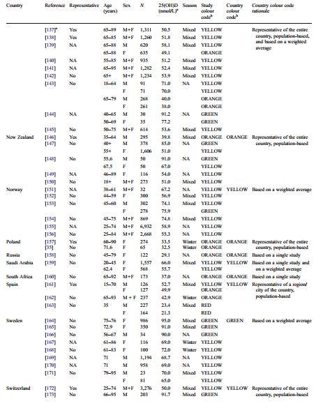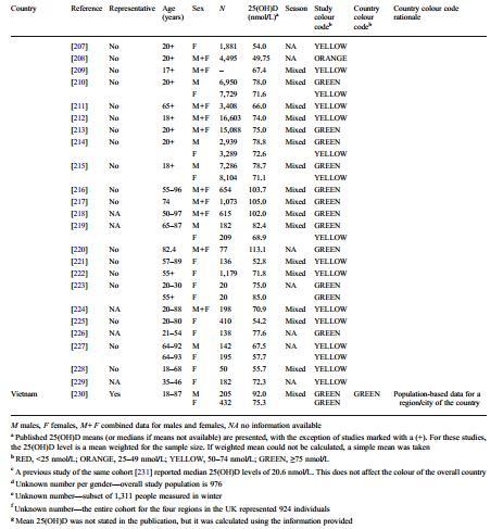 Country colour was based on the 25(OH)D level (either the weighted mean or median) of one or more representative studies, if available. If not available, it was based on one or more studies fitting the second criterion cited above, and so forth. A study was considered representative if it represented the entire population for a certain age and sex group in a certain country, region or city. Studies with a selection bias, which excluded individuals for example on the basis of health status, ethnicity, physical abilities, language, smokers and social economic status, were classified as non-representative. However, for some studies, such information was not described in the text.
