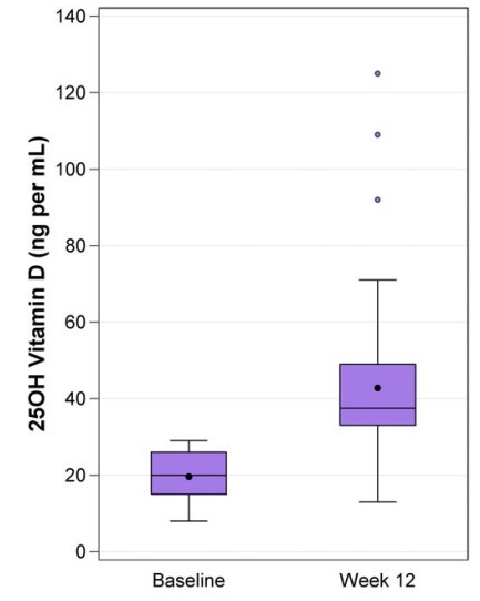 Methods. Human immunodeficiency virus-positive adults on suppressive ART underwent routine serum 25-hydroxyvitamin D (25OHD) screening. Persons with vitamin D insufficiency (25OHD <30 ng/mL) received open-label, oral vitamin D3 50 000 international units (IU) twice weekly for 5 weeks, then 2000 IU daily to complete 12 weeks. We predicted 70% (95% confidence interval, 60%–80%) repletion to 25OHD ≥30 ng/mL compared with 85% among historical HIV-negative controls. Eighty participants provided 91% power to detect this difference. Ability to maintain 25OHD ≥30 ng/mL after 24 weeks was also assessed.