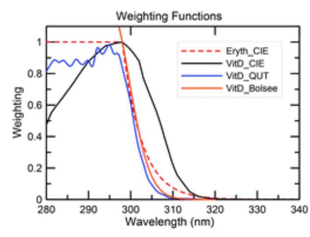 Ethnicity differences were the only significant factor, with Asians producing the least vitamin D, and Maori the most. There was no statistically significant improvement in consistency between sources for any of the three pre-vitamin weightings compared with that for erythema. Further work is needed to verify which vitamin D action spectrum is most appropriate. Nevertheless, these small doses of UV from artificial sources were helpful in quantifying the relationship between UV exposure and vitamin D status among the New Zealand population.