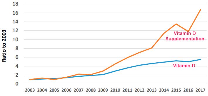 Figure 1. Ratio of number of annual publications (compared to 2003) with vitamin D in the title (all vitamin D), and with vitamin D supplementation or supplement(s) in the title (Pubmed: https://www.ncbi.nlm.nih.gov/pubmed/).