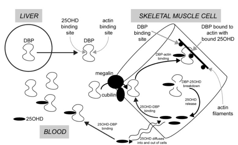 These results (28-31) suggested that muscle cells had the ability to take up 25(OH)D from blood and that the capacity to do so was increased by some change associated with regular physical exercise. DBP in the circulation is synthesised and secreted by the liver. This protein has two specific, high- affinity binding sites. One is for vitamin D and its metabolites, with the highest affinity being for 25(OH)D (Kd < 1 nM). One of the curious features of DBP is that it has an additional binding site for actin (32) . Various investigators have proposed that this functions as a scavenger of actin which might be released into the circulation when there is cellular injury (33, 34). A commonly-held theory postulates that the actin-binding site of DBP, functions to bind actin if released into blood from damaged cells and thus protects against intravascular coagulation. Yet it was known over 30 years ago that DBP becomes tightly bound to actin in skeletal muscle. (35). This raised the question as to whether DBP might be incorporated into muscle cells via a cell membrane megalin-mediated process, in a similar fashion to the incorporation of DBP into hepatic stellate cells and its subsequent binding to intracellular actin (36) . We proposed that the plasma membrane of skeletal muscle cells contains the proteins megalin and cubulin and that these function to transfer extracellular DBP into the cytoplasm of muscle cells where it binds to actin filaments. In this way skeletal muscle cells can contain an array of high affinity binding sites for 25(OH)D in the form of DBP bound to actin. Small amounts of unbound 25(OH)D in the extracellular fluid can, like other hormonal steroids, diffuse through the lipid bilayer of the plasma membrane, into and out of muscle cells. Intracellular DBP, bound to actin thus would provide a mechanism for the accumulation and retention of 25(OH)D in skeletal muscle. However, it has been shown in vivo in rabbits, that DBP in muscle has a short residence time and undergoes proteolytic degradation. When DBP is thus destroyed, any bound 25(OH)D would be released and can then diffuse from the cell and eventually back into the circulation. This process of 25(OH)D passaging into and out of muscle cells therefore would explain the long residence time for this metabolite in the circulation. (Figure 1).