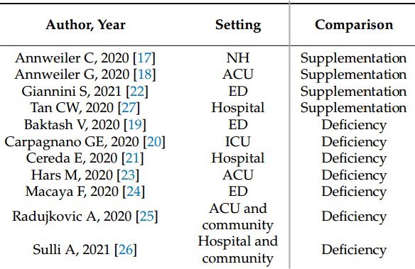 Conclusion: This systematic review seems to support an association between vitamin D deficiency and the risk of COVID-19 in aged people. In addition, vitamin D deficiency appears to expose these subjects to a greater risk of adverse outcomes. Because of its simplicity of administration, and the rarity of side effects, including vitamin D in preventive strategies for certain viral diseases, it appears to be an attractive option.