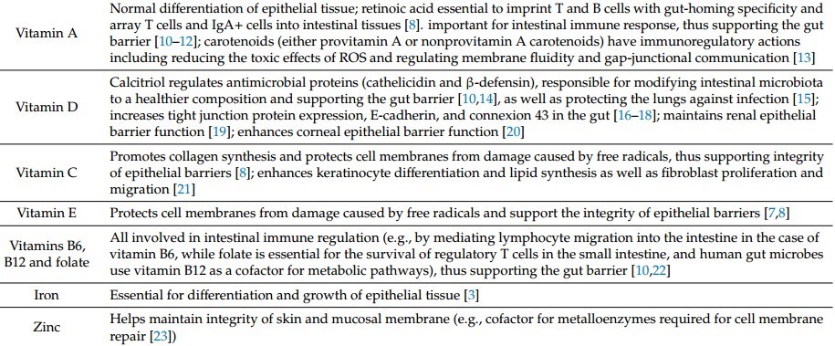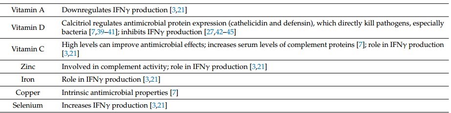At the same time, micronutrients are involved in self-protection of immune cells (via antioxidant mechanisms, e.g., vitamins C and E, zinc, iron, magnesium, copper, and selenium), inhibitory actions (vitamins D, B6, and E), and elimination of spent cells via apoptosis and clearance (limiting tissue damage, e.g., vitamin C).