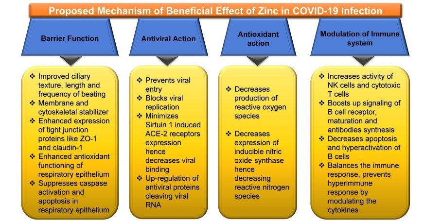 Several vitamins such as vitamin A, B6, B12, C, D, E, and folate; microelement including zinc, iron, selenium, magnesium, and copper; omega-3 fatty acids as eicosapentaenoic acid and docosahexaenoic acid plays essential physiological roles in promoting the immune system.Furthermore, zinc is an indispensable microelement essential for a thorough enzymatic physiological process. It also helps regulate gene-transcription such as DNA replication, RNA transcription, cell division, and cell activation in the human biological system. Subsequently, zinc, together with natural scavenger cells and neutrophils, are also involved in developing cells responsible for regulating nonspecific immunity. The modern food habit often promotes zinc deficiency; as such, quite a few COVID-19 patients presented to hospitals were frequently diagnosed as zinc deficient. Earlier studies documented that zinc deficiency predisposes patients to a viral infection such as herpes simplex, common cold, hepatitis C, severe acute respiratory syndrome coronavirus (SARS-CoV-1), the human immunodeficiency virus (HIV) because of reducing antiviral immunity. This manuscript aimed to discuss the various roles played by zinc in the management of COVID-19 infection.