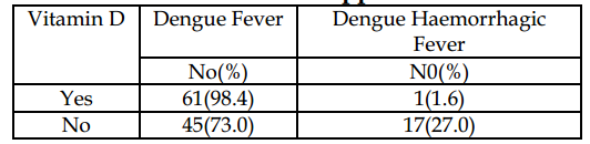 Those not receiving vitamin D were more likely to develop dengue hemorrhagic fever (χ2 = 16.43, P = 0.00). The relative risk of progressing to dengue hemorrhagic fever in patients who received vitamin D compared with those who did not receive vitamin D was 0.0588 (95% CI: 0.0081, 0.4285). However, this study did not assess whether patients were vitamin D deficient at baseline, and did not contain any information about the patients’ diets.