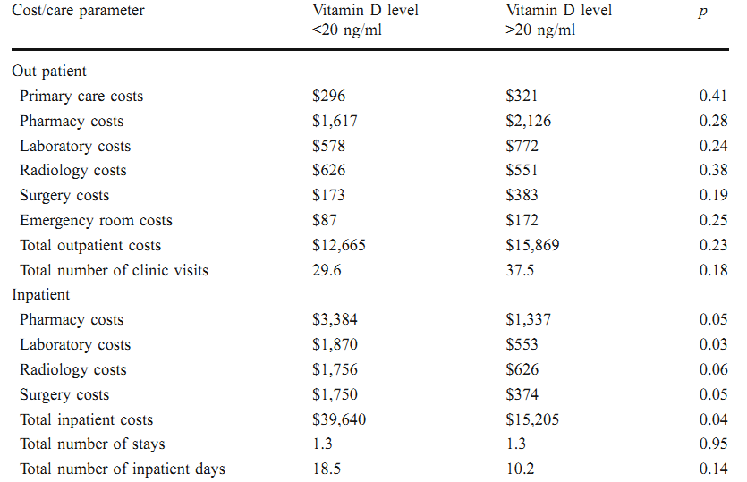Patients with both infections were vitamin D deficient to a similar extent and so were combined for further analysis. Vitamin D deficient patients had higher costs and service utilization than those who were not vitamin D deficient.