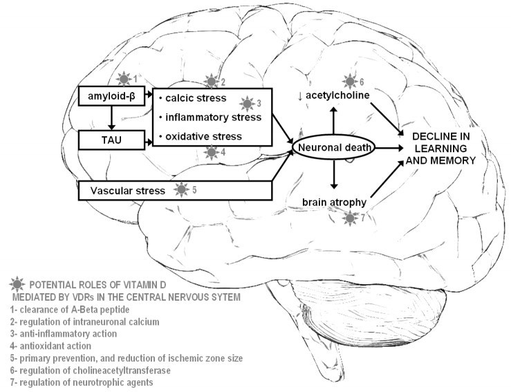 Besides its classical function of bone metabolism regulation, vitamin D has exhibited multiple biological targets mediated by its nuclear hormone receptor, the Vitamin D Receptor (VDR) (12,13). Specific actions on target organs such as the central nervous system (CNS) have been described, providing evidence for a neurosteroid action of vitamin D (13). In particular, VDRs are present in neurons and glial cells of the hippocampus, cortex and sub-cortex, all regions essential to cognition. The binding of vitamin D on the VDRs triggers neuronal protection against AD degenerative processes, including anti-inflammatory action, antioxidant effect, control of calcium homeostasis by regulating the concentration of intracellular calcium in hippocampal neurons, anti-atrophic effect by regulating neurotrophic agents, attenuation of AB42 peptide accumulation by stimulating the phagocytosis of AB peptide together with enhancing brain-to-blood AB efflux transport at the blood-brain barrier, and the prevention of acetylcholine defect by increasing the activity of choline acetyltransferase (thus the bioavailability of acetylcholine) in the brain (12-14). These experimentally-described neuroprotective properties of vitamin D may help, in the case of normalized vitamin D status, to address against the decline of brain function in AD, especially against cognitive decline (Figure 1).