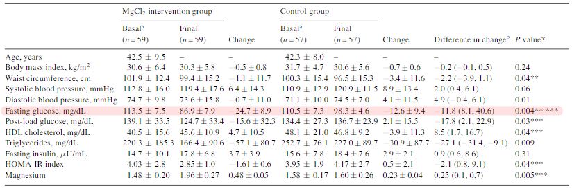 At baseline, there were no significant statistical differences in terms of anthropometric and biochemical variables between individuals in the supplement and placebo groups. At the end of follow-up fasting (86.9 ± 7.9 and 98.3 ± 4.6 mg/dL, respectively; P = 0.004) and post-load glucose (124.7 ± 33.4 and 136.7 ± 23.9 mg/dL, respectively; P = 0.03) levels, HOMA-IR indices (2.85 ± 1.0 and 4.1 ± 2.7, respectively; P = 0.04) and triglycerides (166.4 ± 90.6 and 227.0 ± 89.7, respectively; P = 0.009) were significantly decreased, whereas HDL cholesterol (45.6 ± 10.9 and 46.8 ± 9.2 mg/dL, respectively; P = 0.04) and serum magnesium (1.96 ± 0.27 and 1.60 ± 0.26 mg/dL, respectively; P = 0.005) levels were significantly increased in those taking MgCl2 compared with the controls. A total of 34 (29.4%) people improved their glucose status (50.8% and 7.0% in the magnesium and placebo groups, respectively; P < 0.0005).